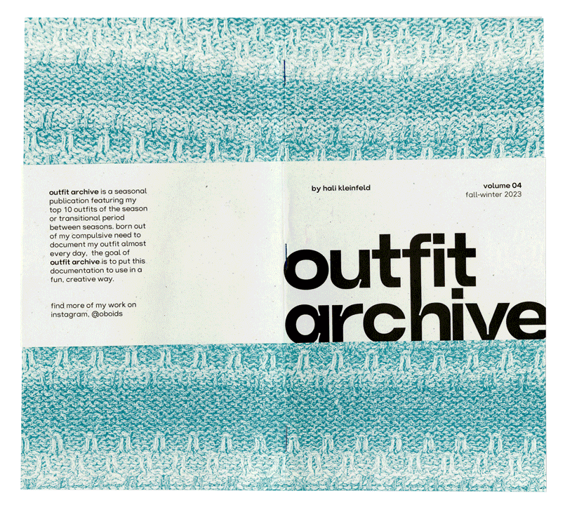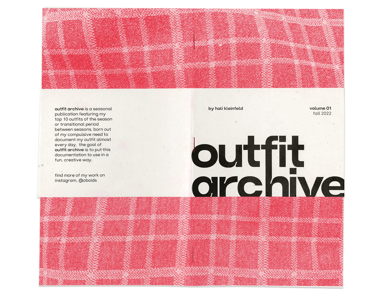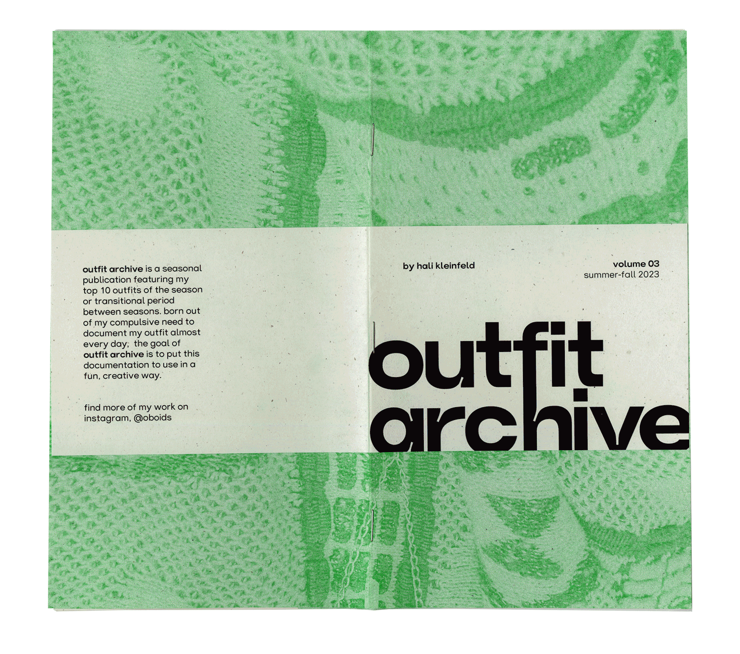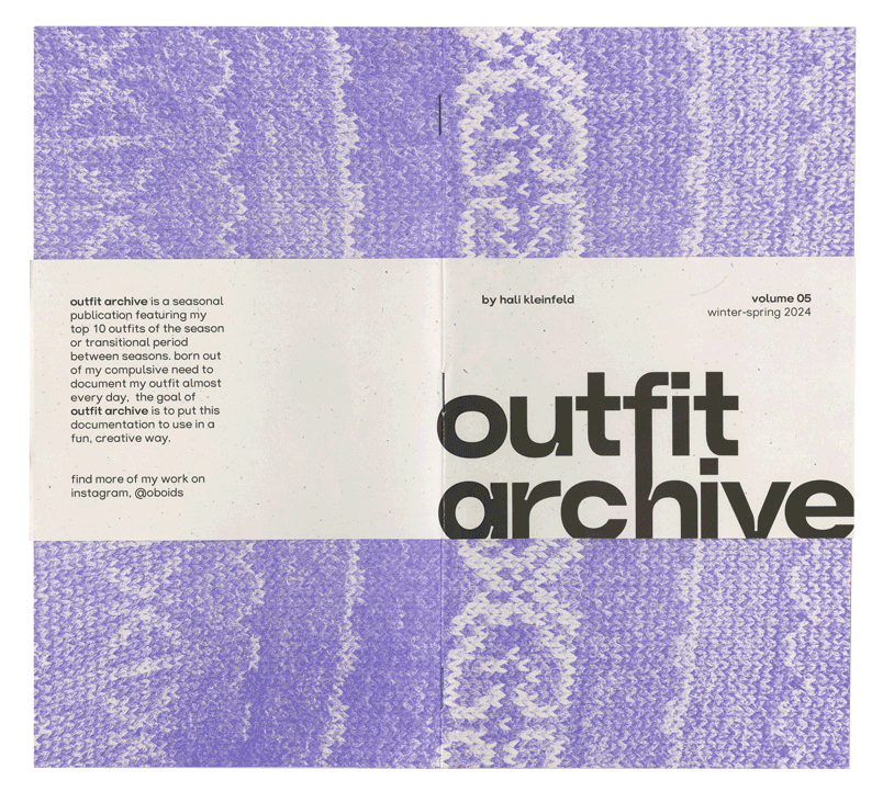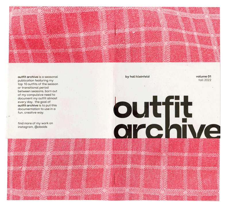 outfit archive is my approach to a publication that can be easily iterated on based on a sole template or system. born out of my college self’s compulsive need to document my outfit every day, outfit archive is a fun and creative way to put this documentation to use. originally intended to be a one-off issue, I expanded this project to five full books for my senior show at SAIC.
