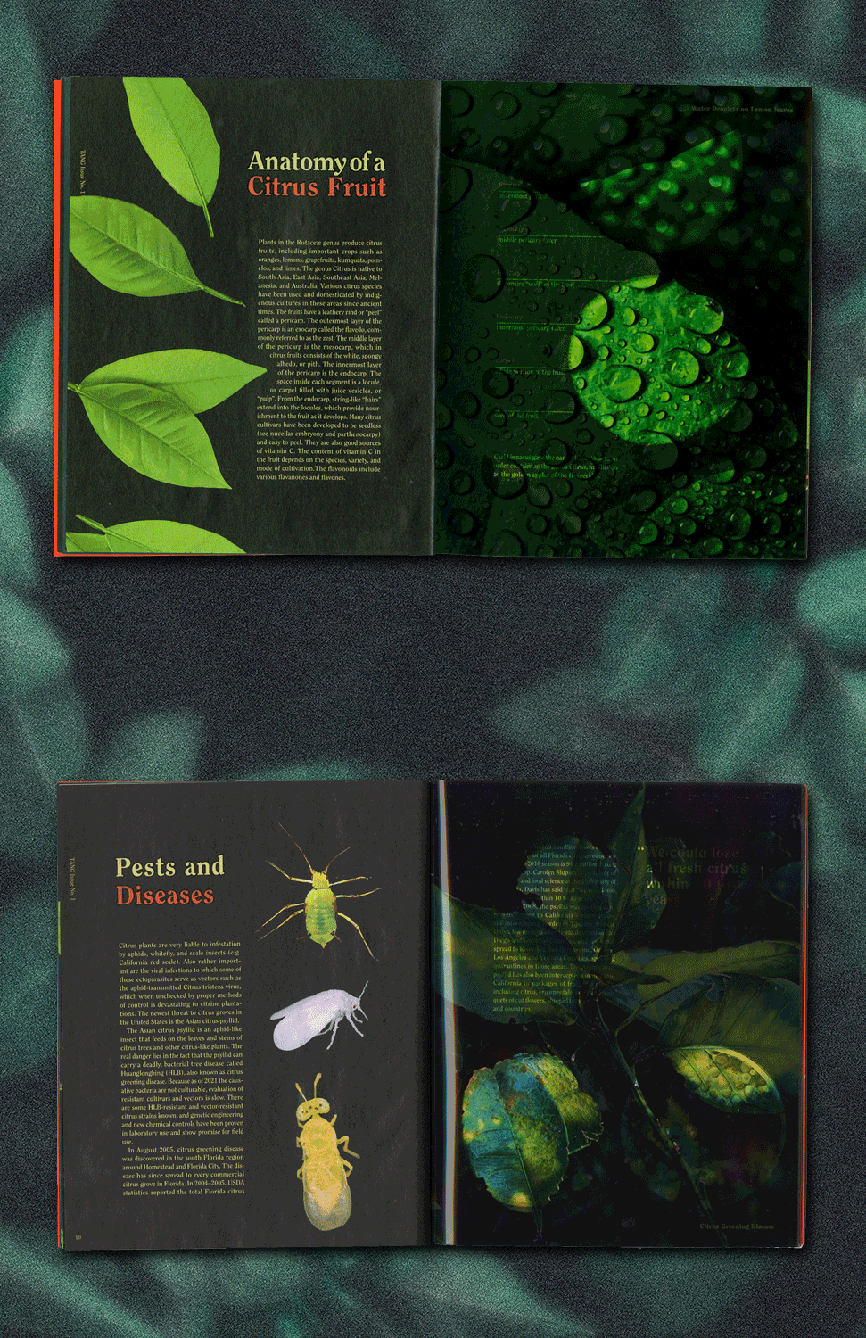 the cover is made of an entirely different material than the inside, creating a “rind” for the softer inside pages. since the insides of citrus fruits are divided into smaller sections, I created that effect by including transparency inserts between certain spreads, allowing the texture of the project to speak to the design.